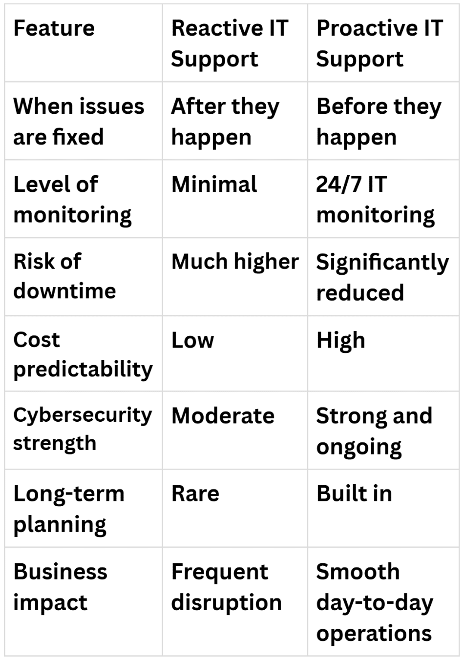 Reactive support focuses on repair. Proactive support focuses on prevention. With businesses relying more heavily on cloud services, online payments, remote working and cybersecurity, prevention is now the smarter and safer option.